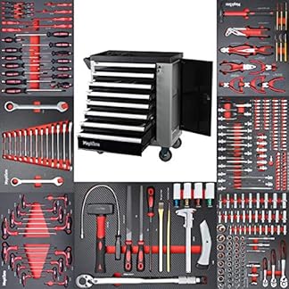 Mephisto Werkzeugwagen Werkstattwagen mit 8 Schubladen Davon 7 mit Werkzeug wie Schraubenschlüssel, Ratsche mit Nusskasten, Schraubendreher usw. in Soft Inlays in Carbonoptik befüllte Schubladen