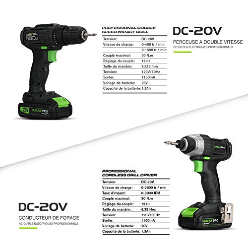 GALAX PRO Kombibohrmaschine, 20 V, Bohrmaschine, kabellos, 30 Nm, Schlagschrauber, 100 Nm mit 1 Akku 1,3 Ah, Ladegerät, Zubehör 11 Stück und Werkzeugtasche