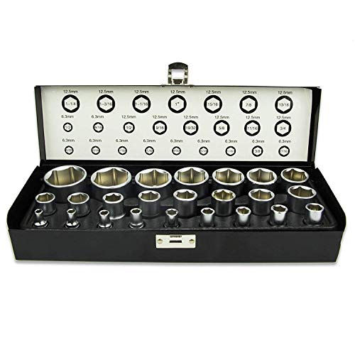 ✔ 13 Steckschlüssel mithilfe 1/2″ Maschine innen Vierkant: 1/2 ; 9/16 ; 19/32 5/8 ; 11/16 ; 3/4 ; 13/16 ; 7/8 ; 15/16 ; 1 ; 1.1/16 ; 1.3/16 ; 1.1/4 ✔ Gewerbe-Geheiß ✔ Chrom Vanadium Stahl ✔ Sortiert in der stabilen Metallkassette