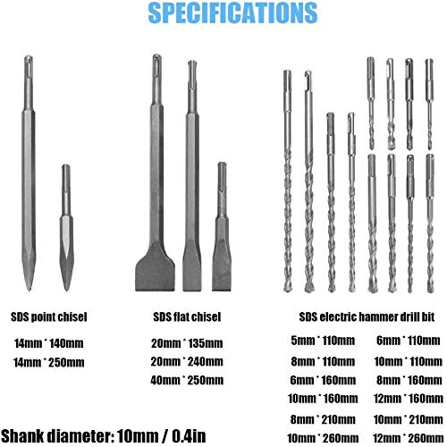 ★ Dies ist ein Set von Elektrowerkzeug-Zubehör, einschließlich 12 Bohrer und 5 Meißel in verschiedenen Größen und Aufführen.